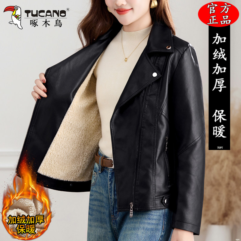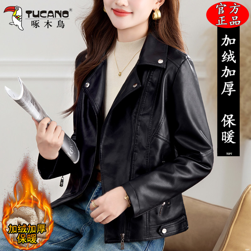 啄木鸟PU皮衣加厚秋冬新款显瘦加绒短款机车夹克女士翻领防风外套