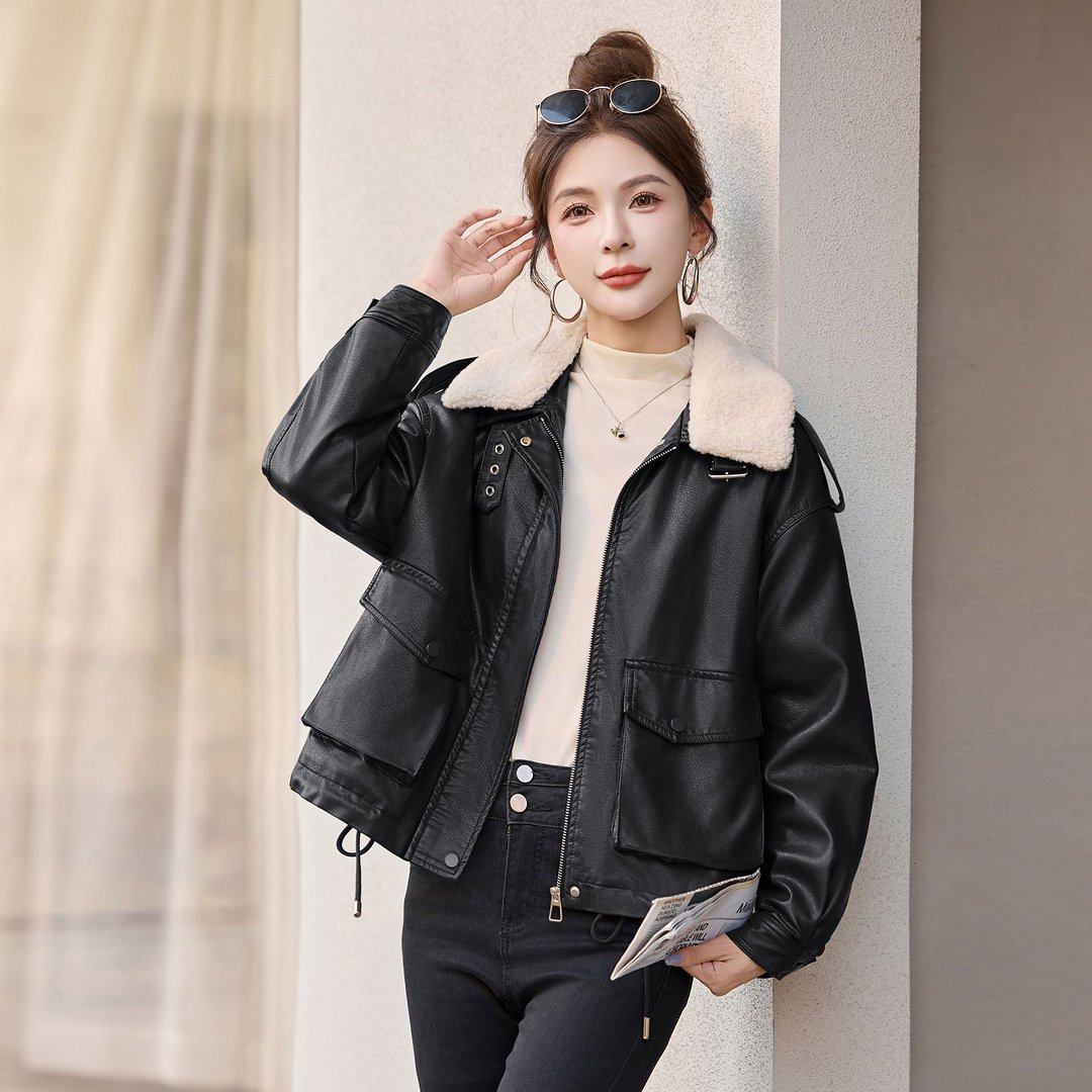 2025冬季新款仿皮毛一体羊羔毛外套女短款翻领加厚机车夹克PU皮衣