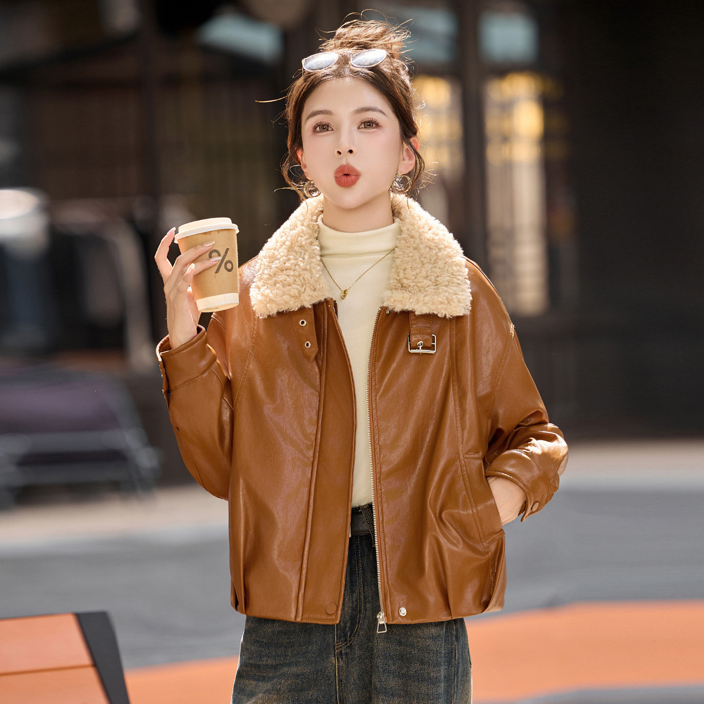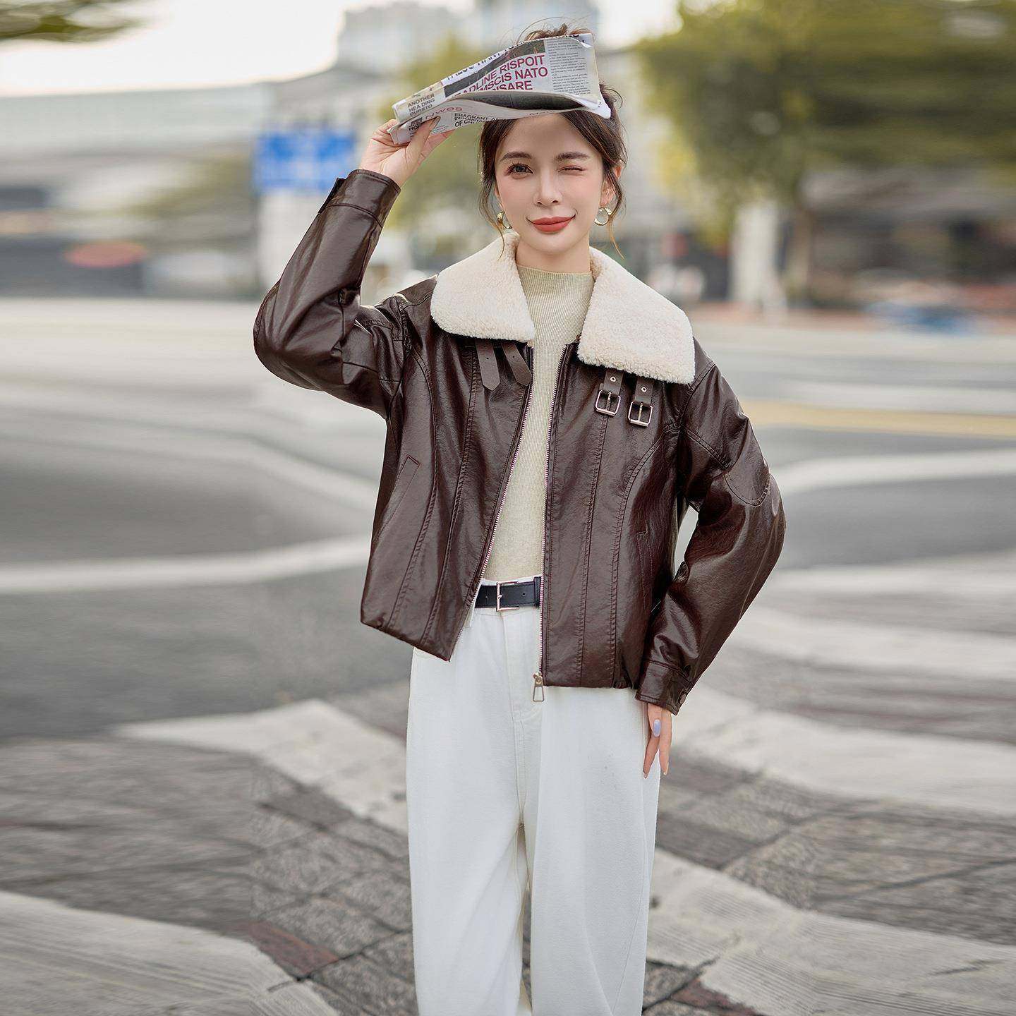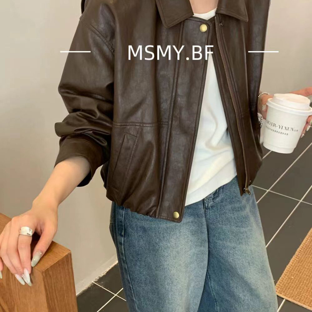 - 皮衣女短款 棕色