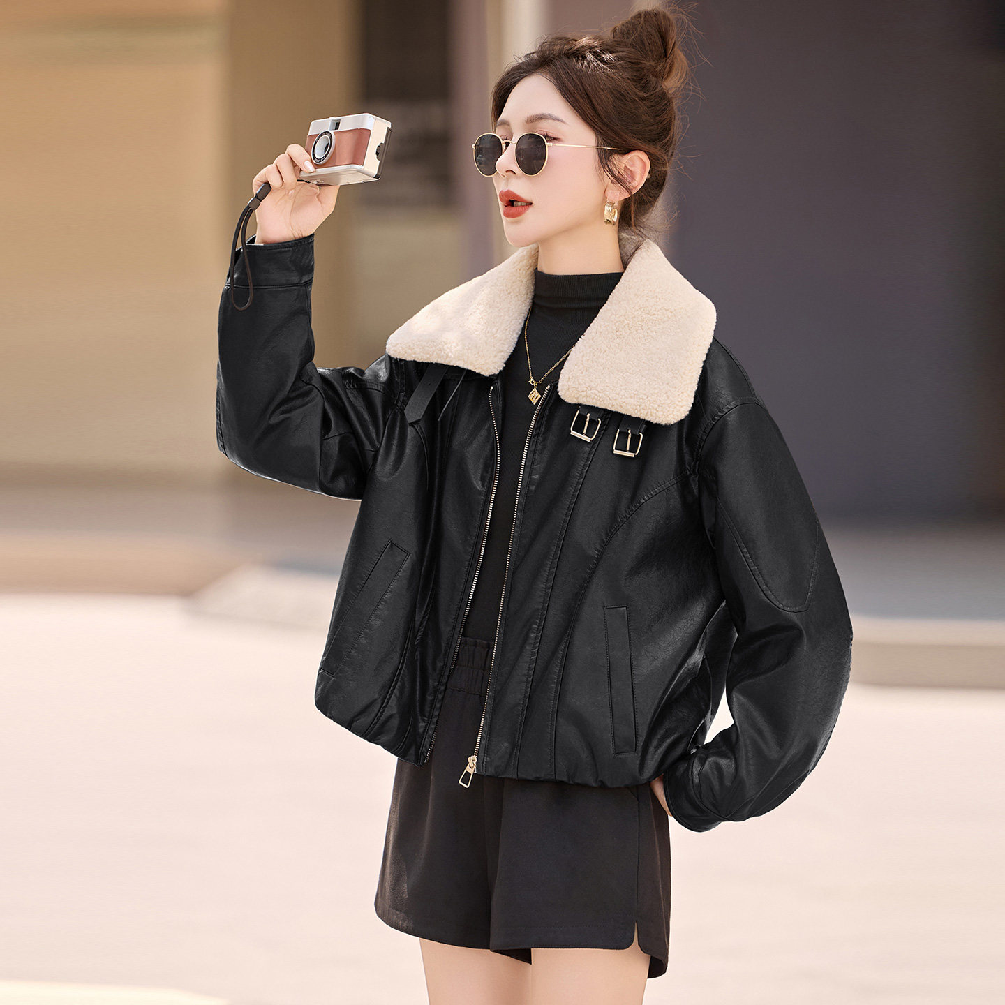 - 翻领机车皮衣女