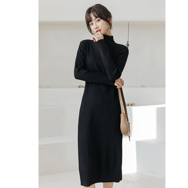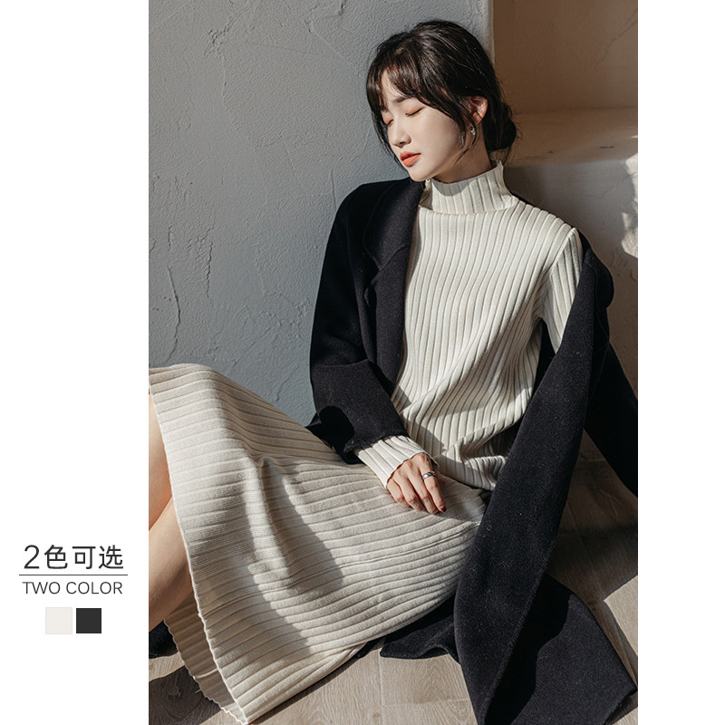 针织打底连衣裙女秋冬内搭半高领配大衣中长款黑白色过膝毛衣裙子