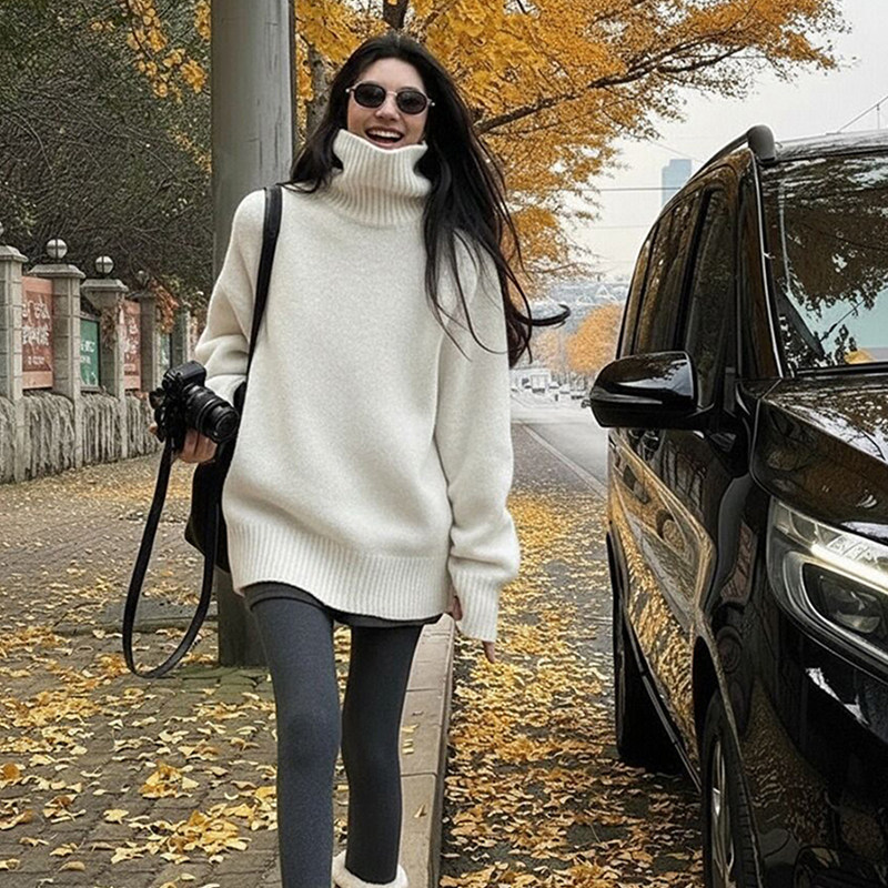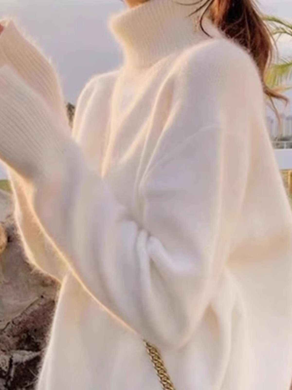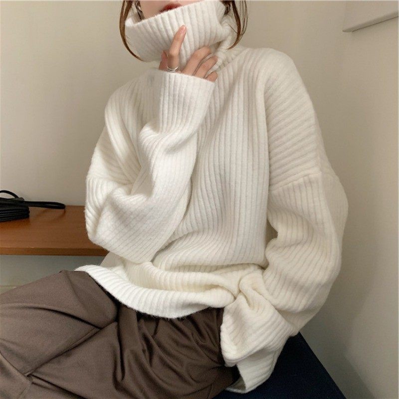 日系慵懒风白色高领毛衣女秋冬季宽松显瘦中长款加厚软糯针织上衣