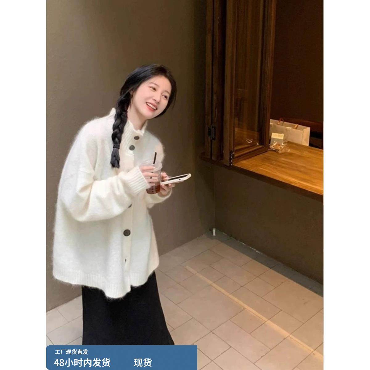 白色奶fufu高领马海毛针织开衫外套女秋冬慵懒宽松中长款立领毛衣