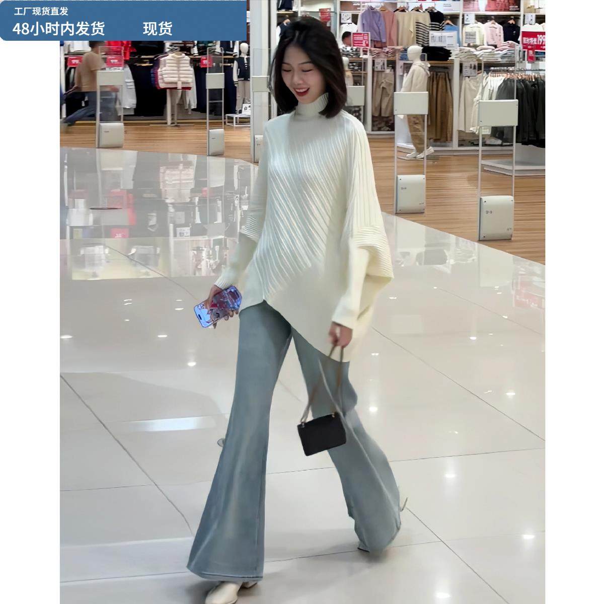 白色高领不规则蝙蝠袖毛衣宽松高级设计感中长款气质温柔风针织衫