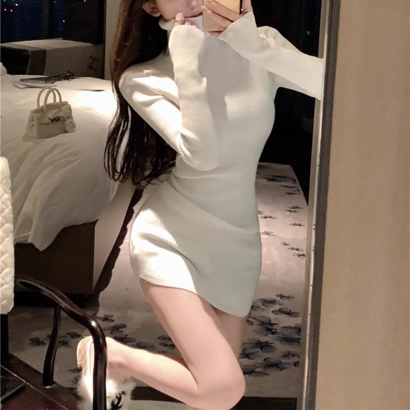 白色高领针织连衣裙女秋冬2025新款修身包臀内搭打底中长款毛衣裙