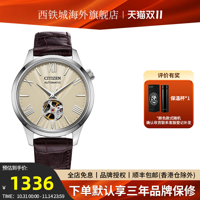 citizen西铁城男镂空表盘全自动机械小牛皮表带商务休闲表NH9136