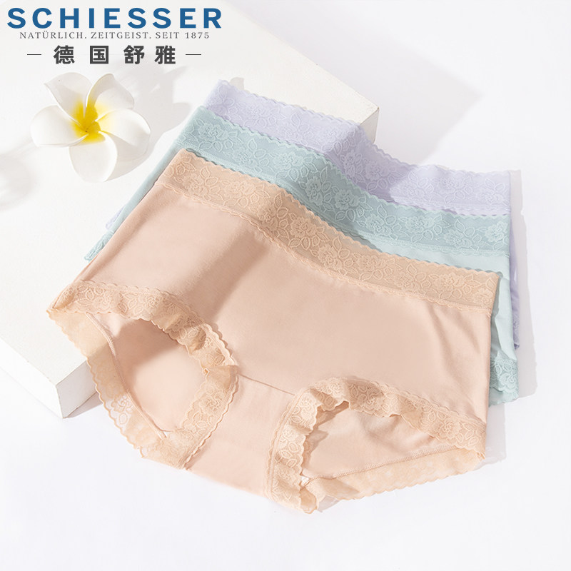 3条装舒雅女士内裤莫代尔桑蚕丝蕾丝边中腰平角底裤薄款透气丝滑