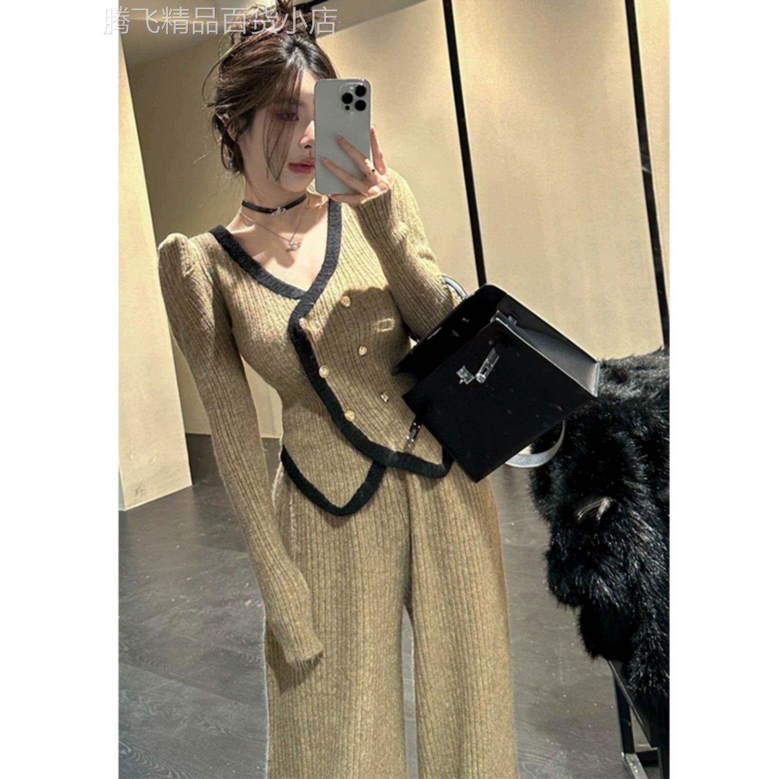韩国小香风时尚套装女秋冬新款时尚气质名媛针织开衫阔腿裤两件套