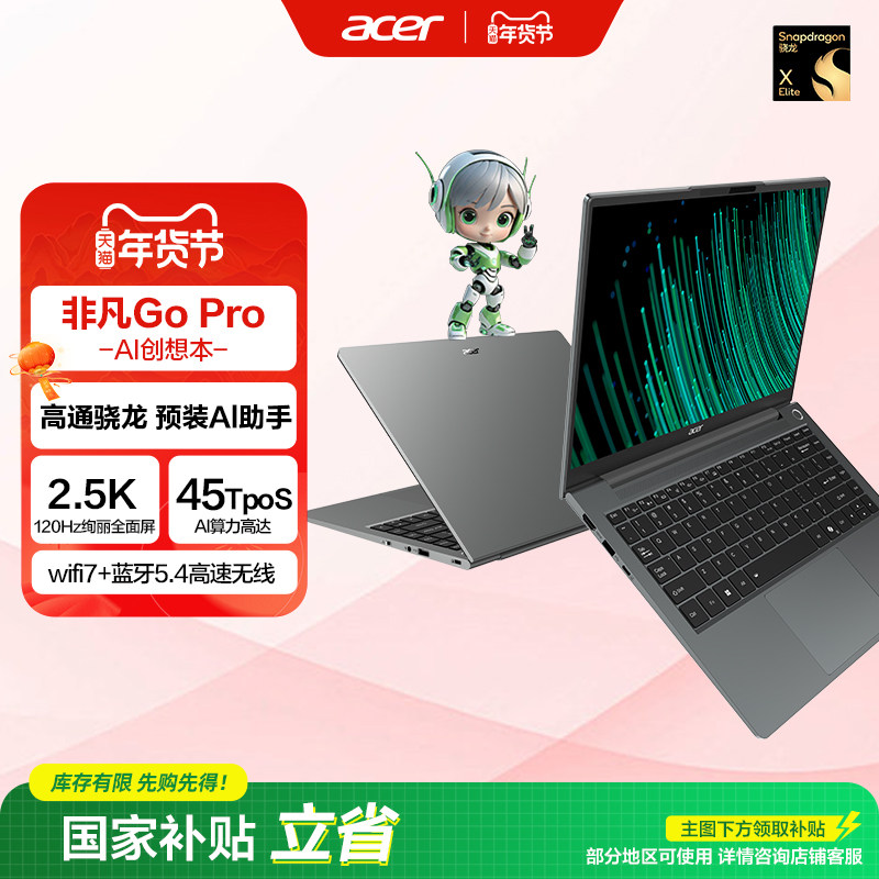 (政府补贴)Acer/宏碁非凡Go pro AIPC智慧轻薄本高通骁龙XElite 14英寸大学生笔记本电脑商务办公