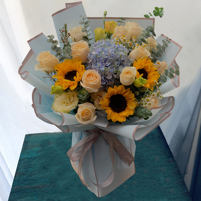 杭州鲜花速递同城向日葵玫瑰花绣球混搭花束男士生日订花店送上门
