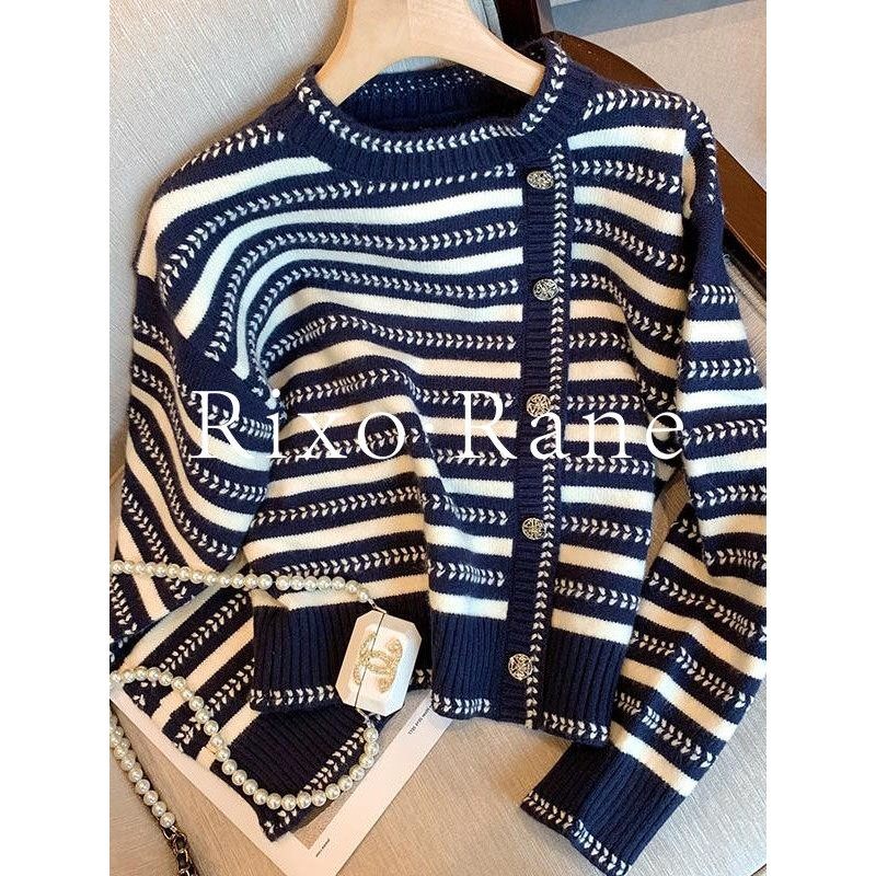 早秋撞色条纹针织衫上衣女韩系穿搭短款小个子慵懒风外搭毛衣开衫