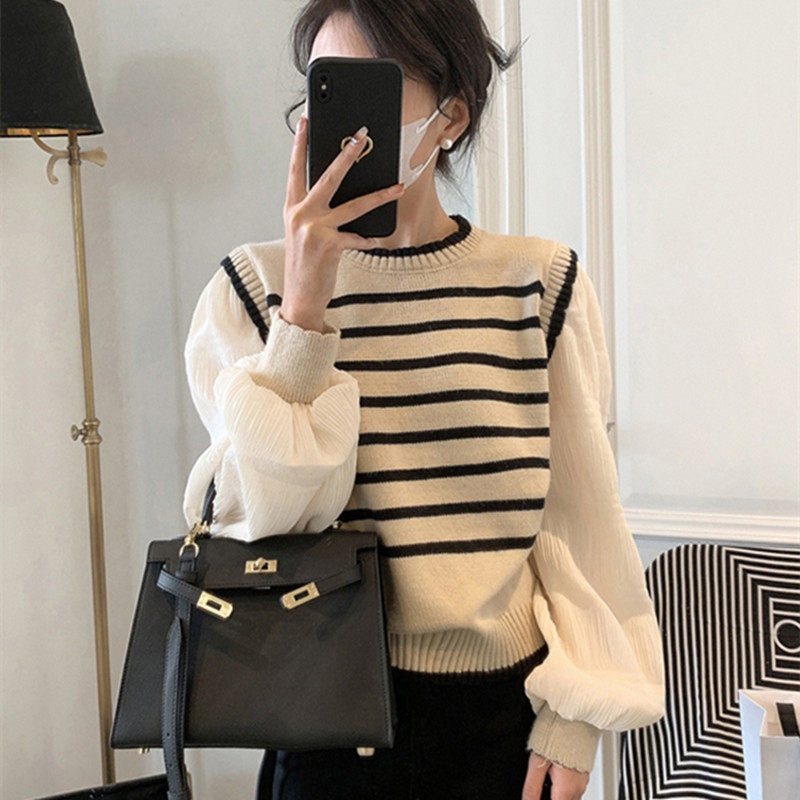 假两件条纹针织衫上衣女2025早春秋新款韩版软糯短款拼接毛衣