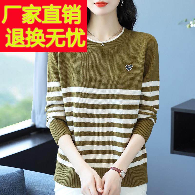 条纹针织衫上衣女秋季新款妈妈装时尚长袖宽松大码圆领毛衣打底衫