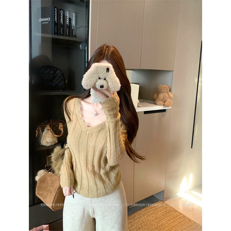 ins韩版松弛感洋气纯色显瘦百搭长袖V领内搭坑条纹针织衫上衣女潮