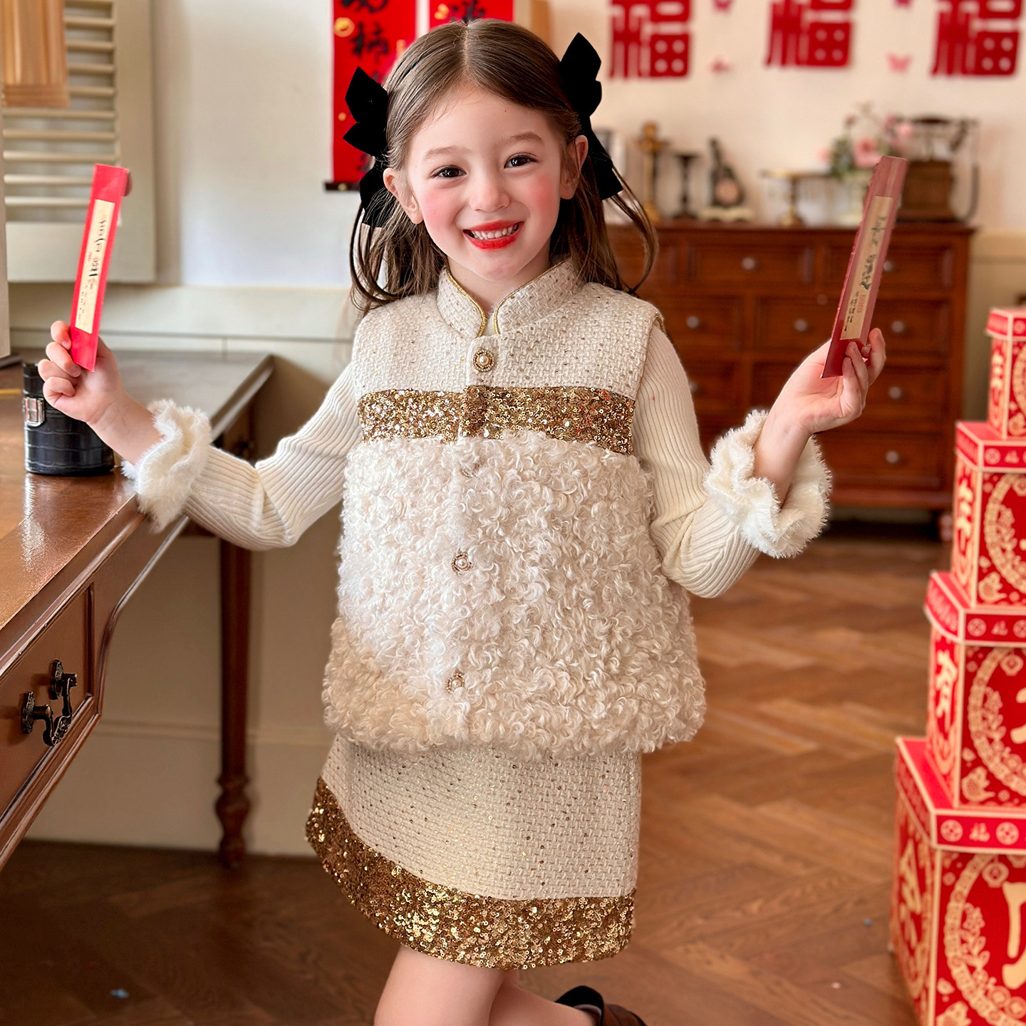 栀了成长记女童装小香风毛绒套装2025冬季儿童马甲亮片夹棉两件套