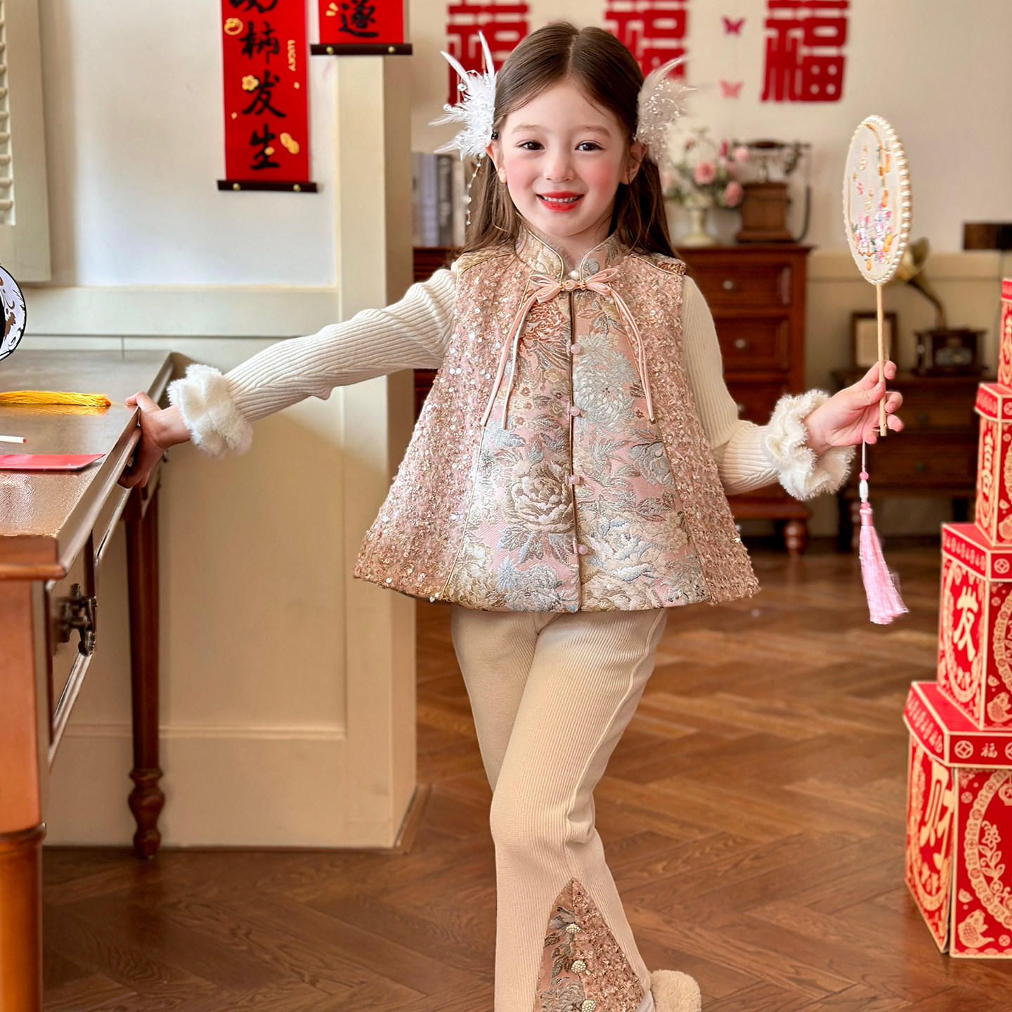 栀了成长记女童装新中式加绒套装2025冬季儿童国风新年甜美两件套