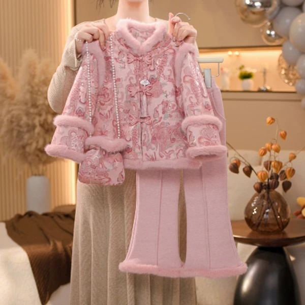 栀了成长童装女童新中式加绒套装2025冬季儿童国风新年提花两件套