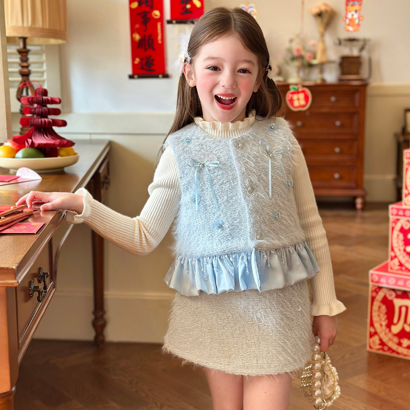 栀了成长记女童装小香风马甲套装2025冬季儿童毛绒保暖甜美两件套