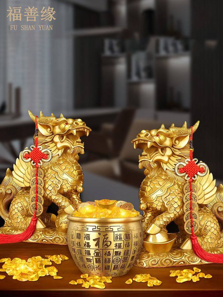 纯铜麒麟摆件一对黄铜火麒麟招财客厅办公室纯家用福禄麒麟大小号