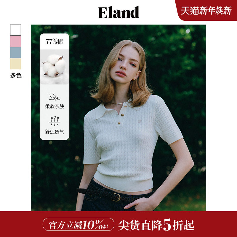【棉棉冰】Eland衣恋短袖女针织T恤绞花毛衣POLO衫夏季款