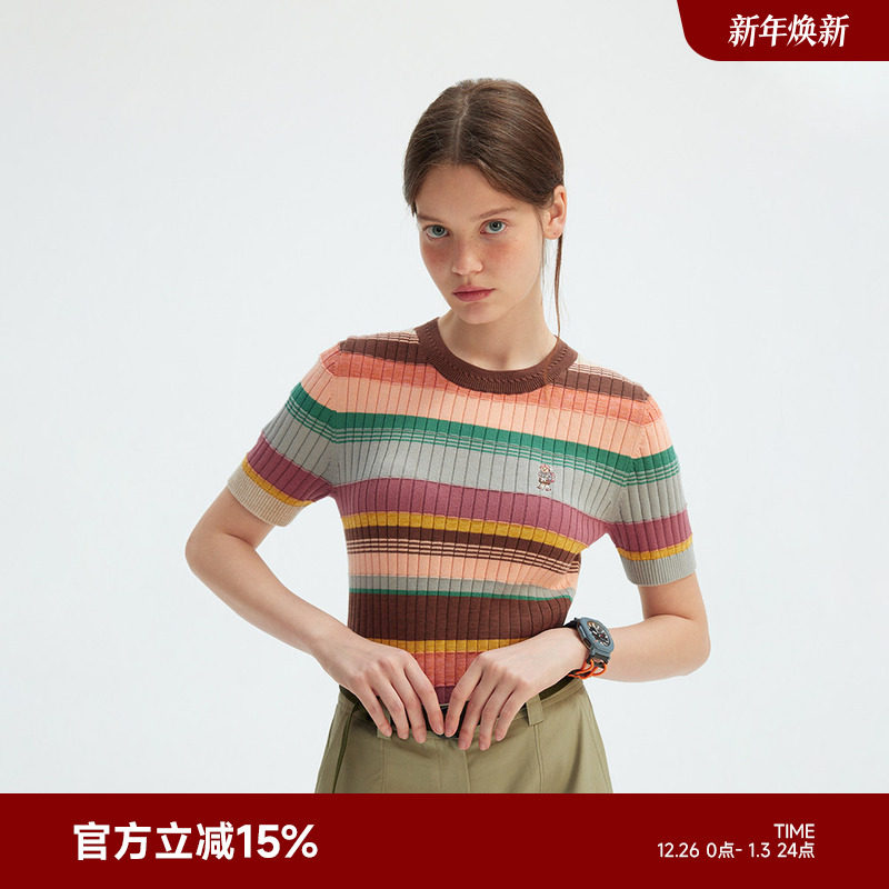TeenieWeenie小熊女装毛衣2025夏季新款多巴胺条纹圆领短袖针织衫