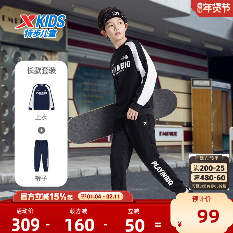 特步儿童套装男童2025年新款拼接加绒长袖儿童套头运动套装中大童
