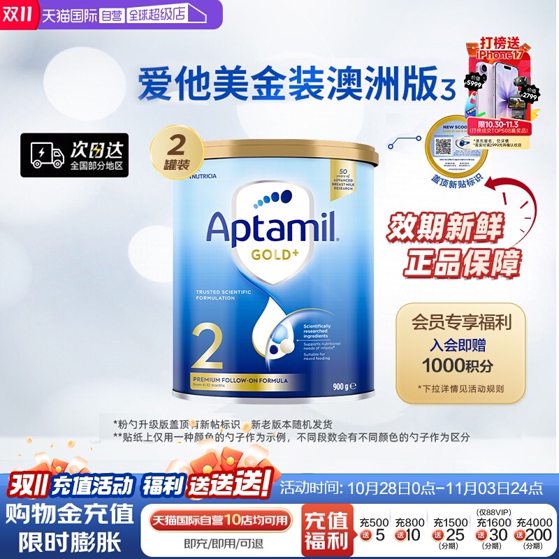 【自营】新西兰爱他美Aptamil进口金装版婴幼儿奶粉2段900g*2罐