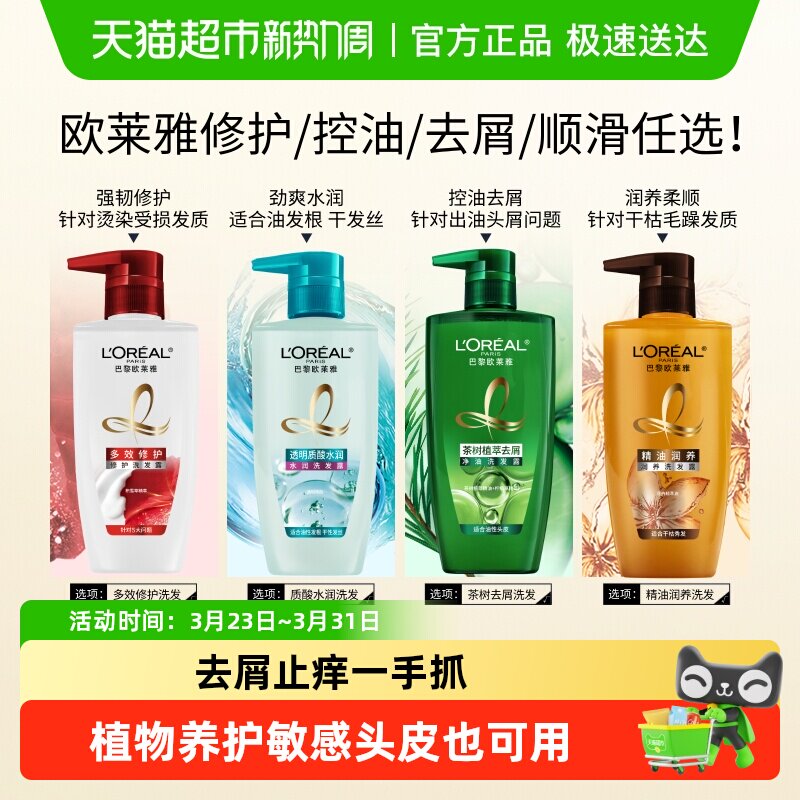 【百亿补贴】欧莱雅精油润养茶树植萃透明质酸洗发水柔顺去屑清爽