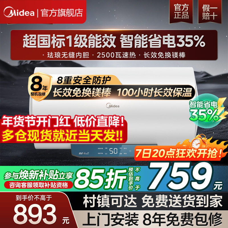 美的一级能效变频电热水器JA5节能60升80L家用速热卫生间出水断电