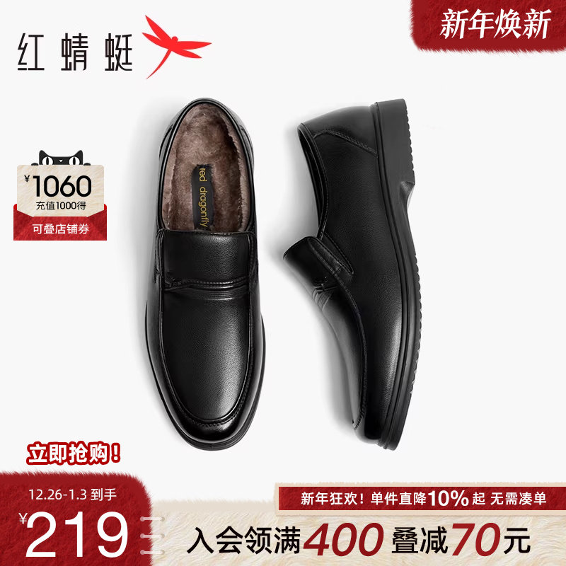 红蜻蜓男士皮鞋冬季新款加绒保暖休闲男鞋真皮中老年棉鞋爸爸鞋子