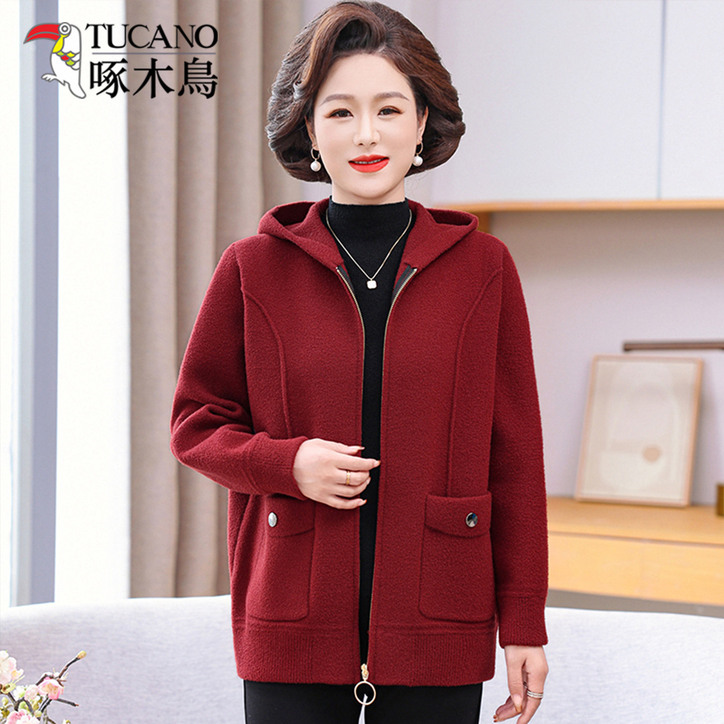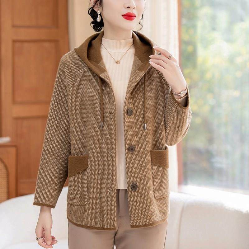 啄木鸟妈妈春装洋气连帽针织外套中年女装新款开衫中老年休闲夹克