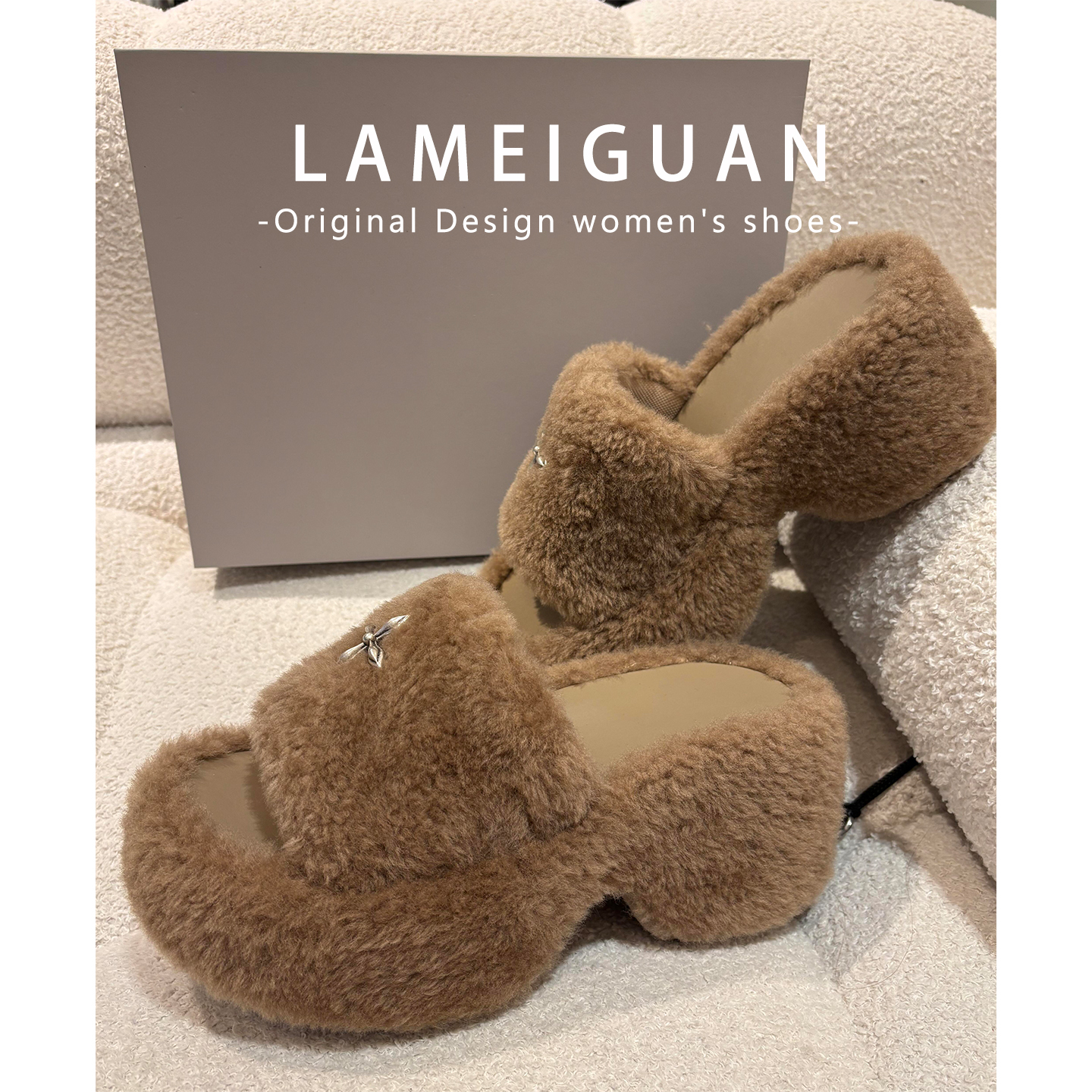 羊皮版~美拉德复古厚底坡跟毛毛拖鞋女方头毛绒保暖露趾一字拖鞋