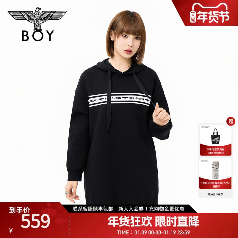 BOYLONDON女款简约黑色印花经典时尚潮牌休闲长袖连衣裙W17908