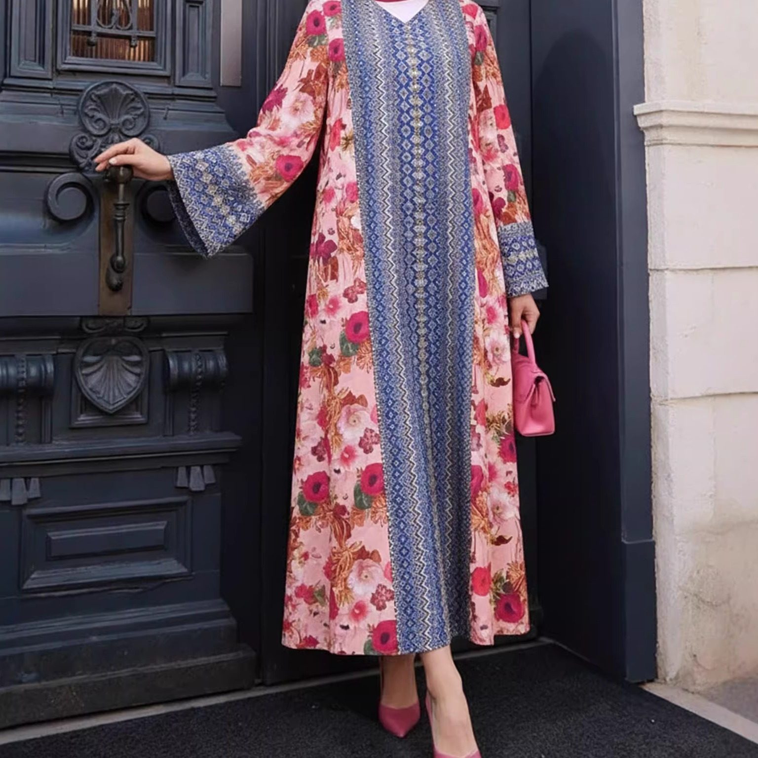 土耳其大码宽松舒适保守大摆长袖气质中东女装长袍印花连衣裙休闲