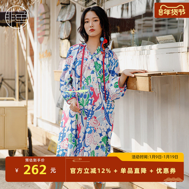 tanni新款度假休闲复古印花圆领荷叶边连衣裙TM31DR009A