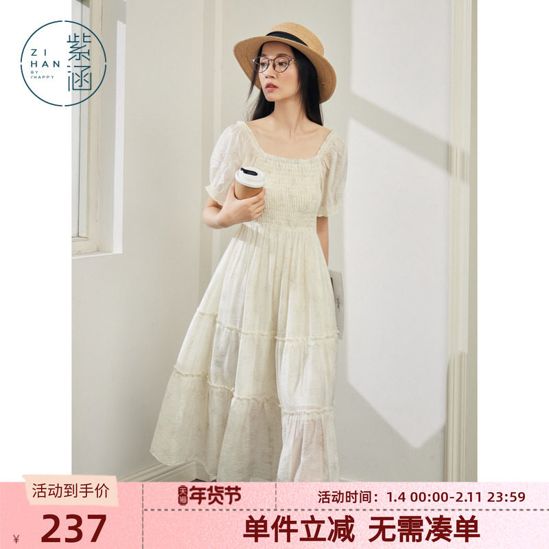 紫涵打揽印花连衣裙女夏季新款法式甜美风休闲收腰显瘦方领中长裙