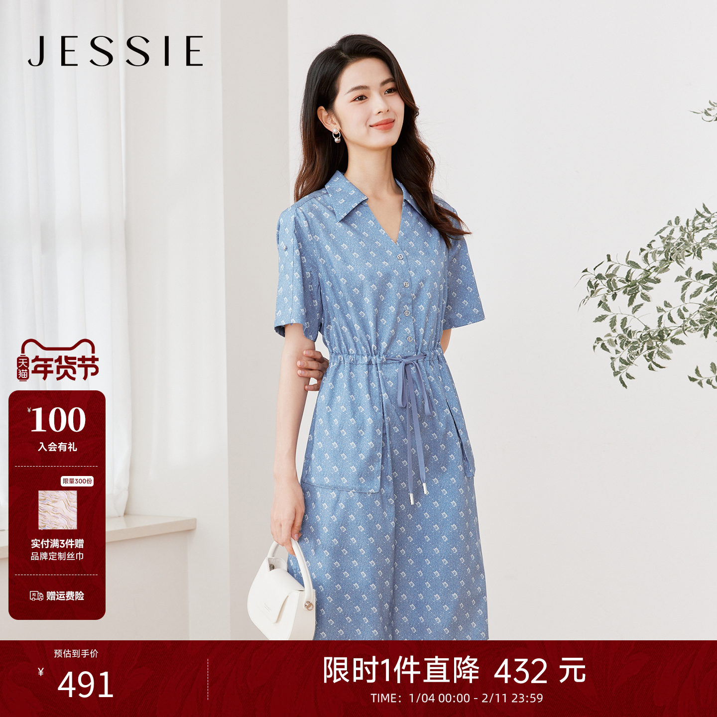 JESSIE气质休闲翻领系带收腰短袖印花连衣裙女夏款通勤显瘦中长裙