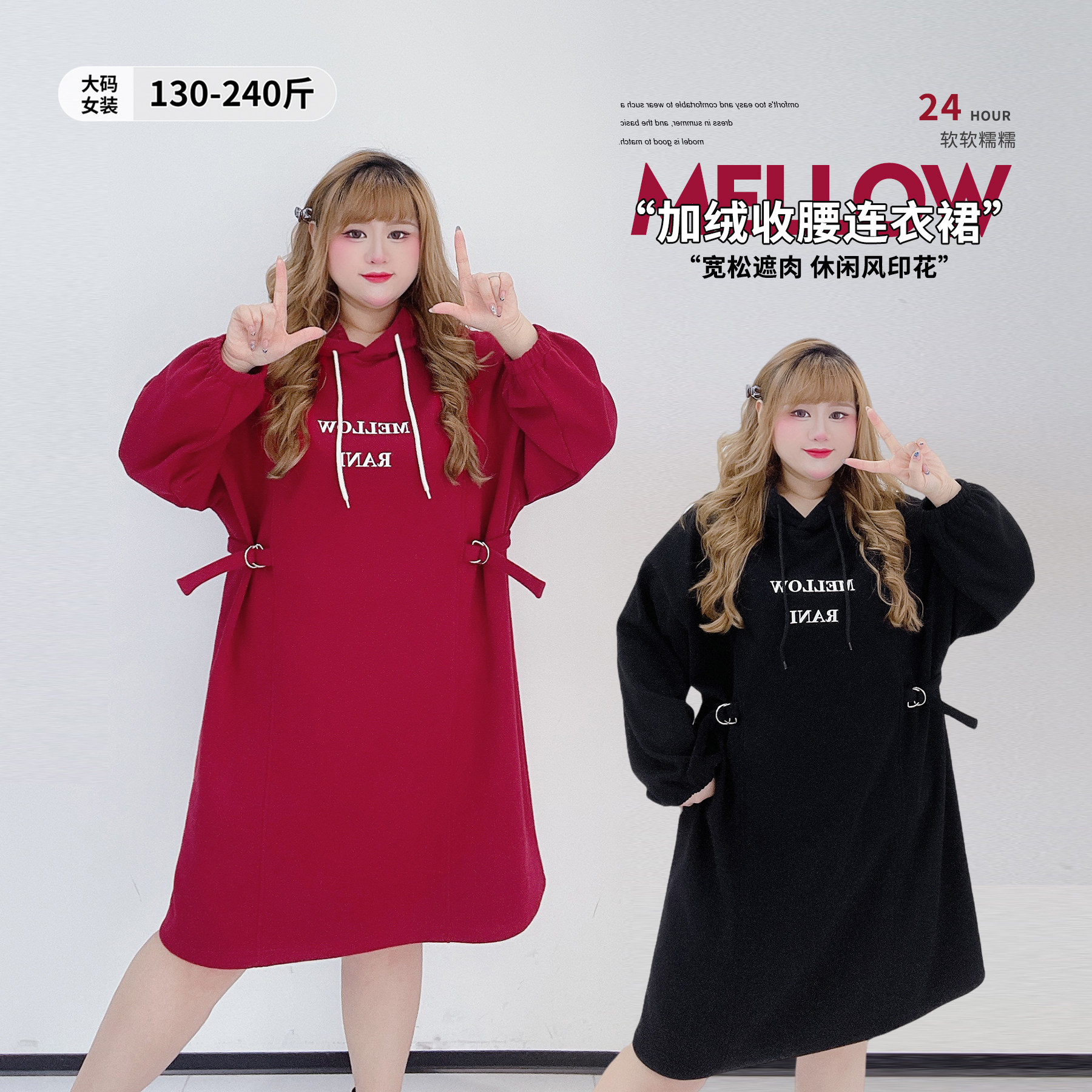 圣诞休闲风印花收腰卫衣裙胖莹莹大码女装秋冬加绒内搭连帽连衣裙