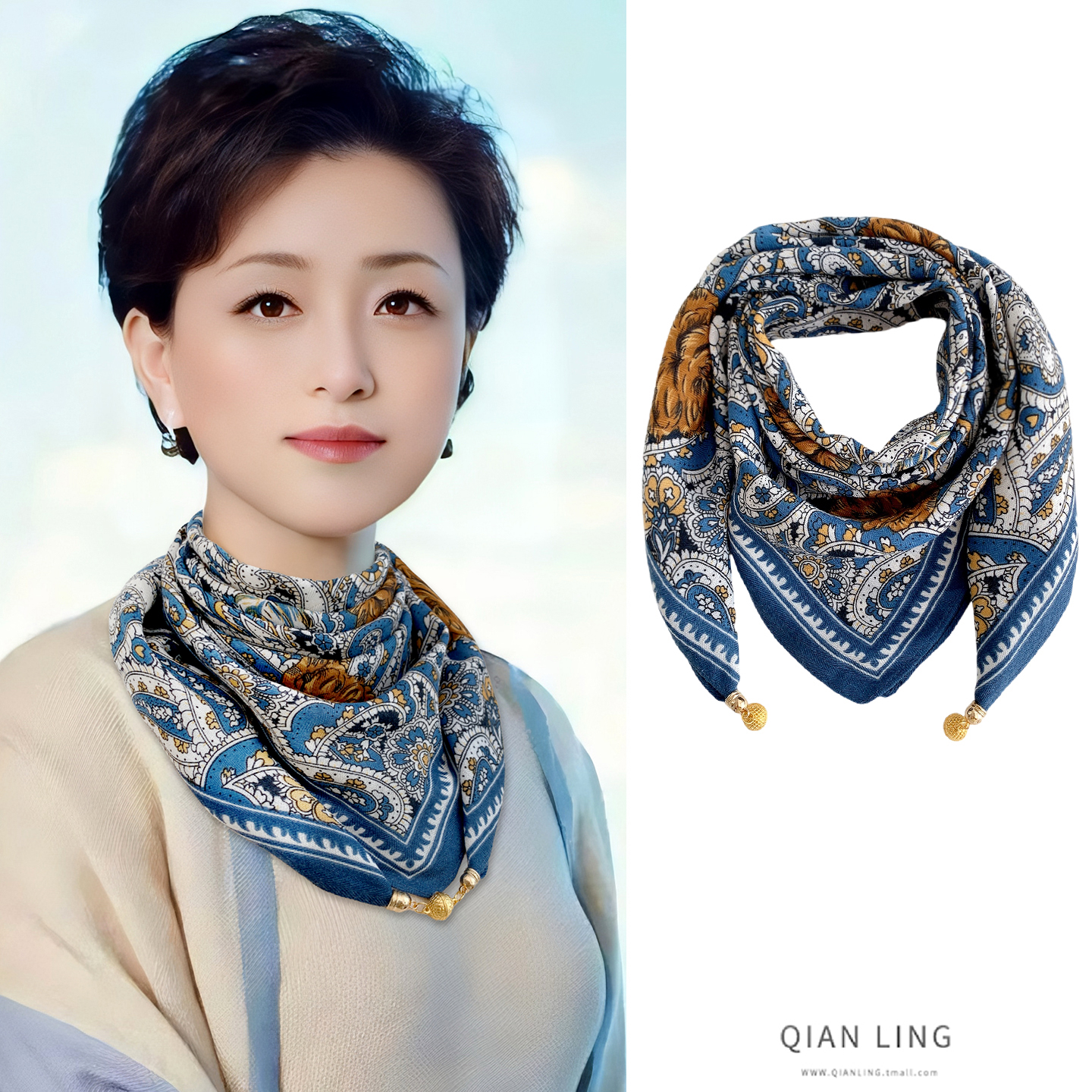 磁吸扣棉麻小方巾丝巾女春秋百搭护颈领巾三角围巾新款保暖围脖冬