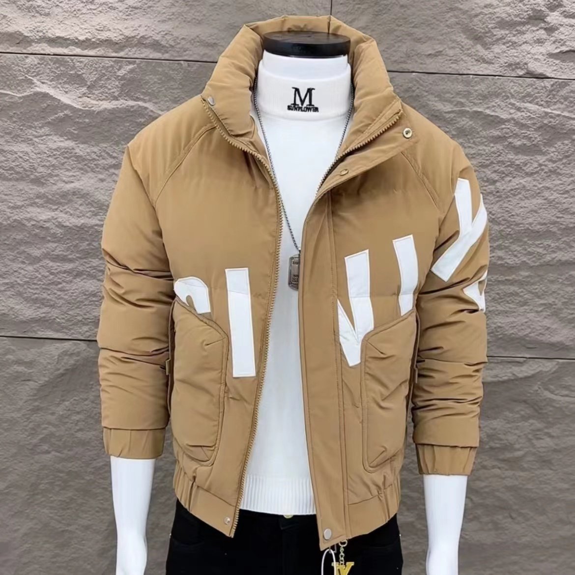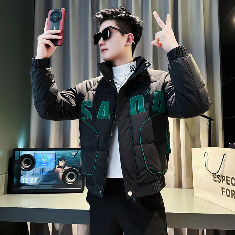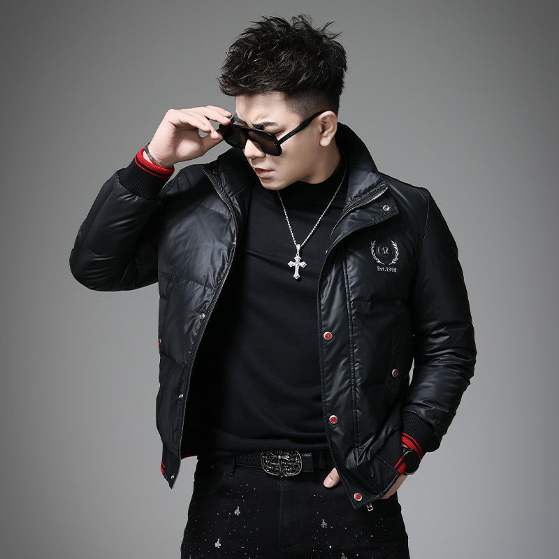 欧货男士羽绒服短款韩版修身潮流帅气保暖立领外套字母印花设计感