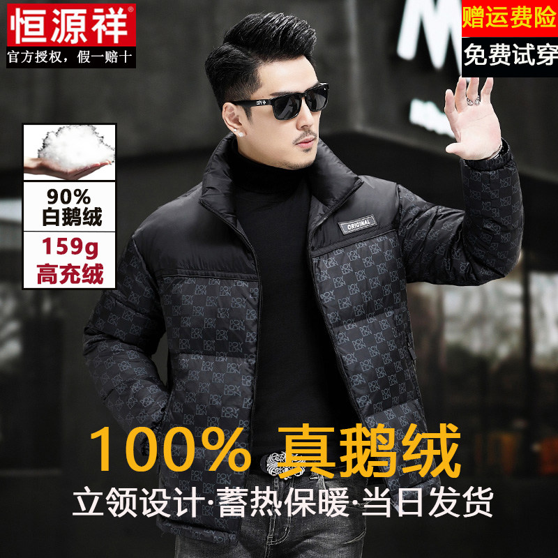 恒源祥冬季鹅绒羽绒服男立领加厚款保暖高档修身潮流印花防寒外套