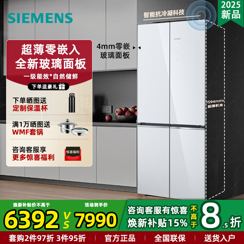 【镇店爆款】西门子超薄十字星497L玻璃四门嵌入式冰箱一级能效