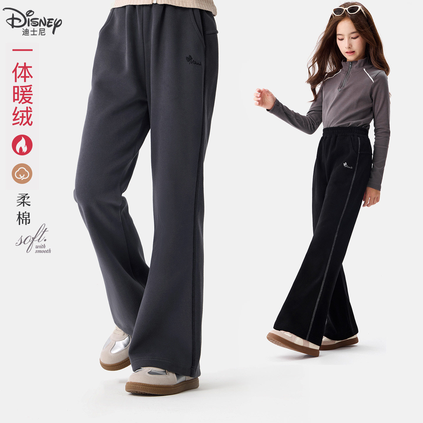 迪士尼儿童加绒裤子秋冬款男女童一体绒休闲百搭长裤校园宽松裤子