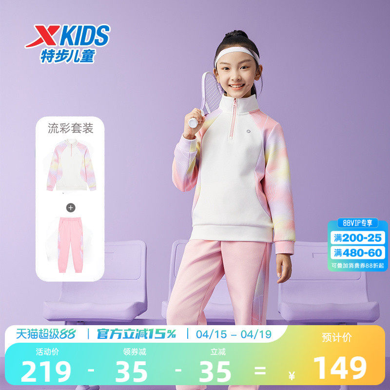 特步童装儿童半开襟卫衣中大童拼接长裤2026春装女童加绒运动套装