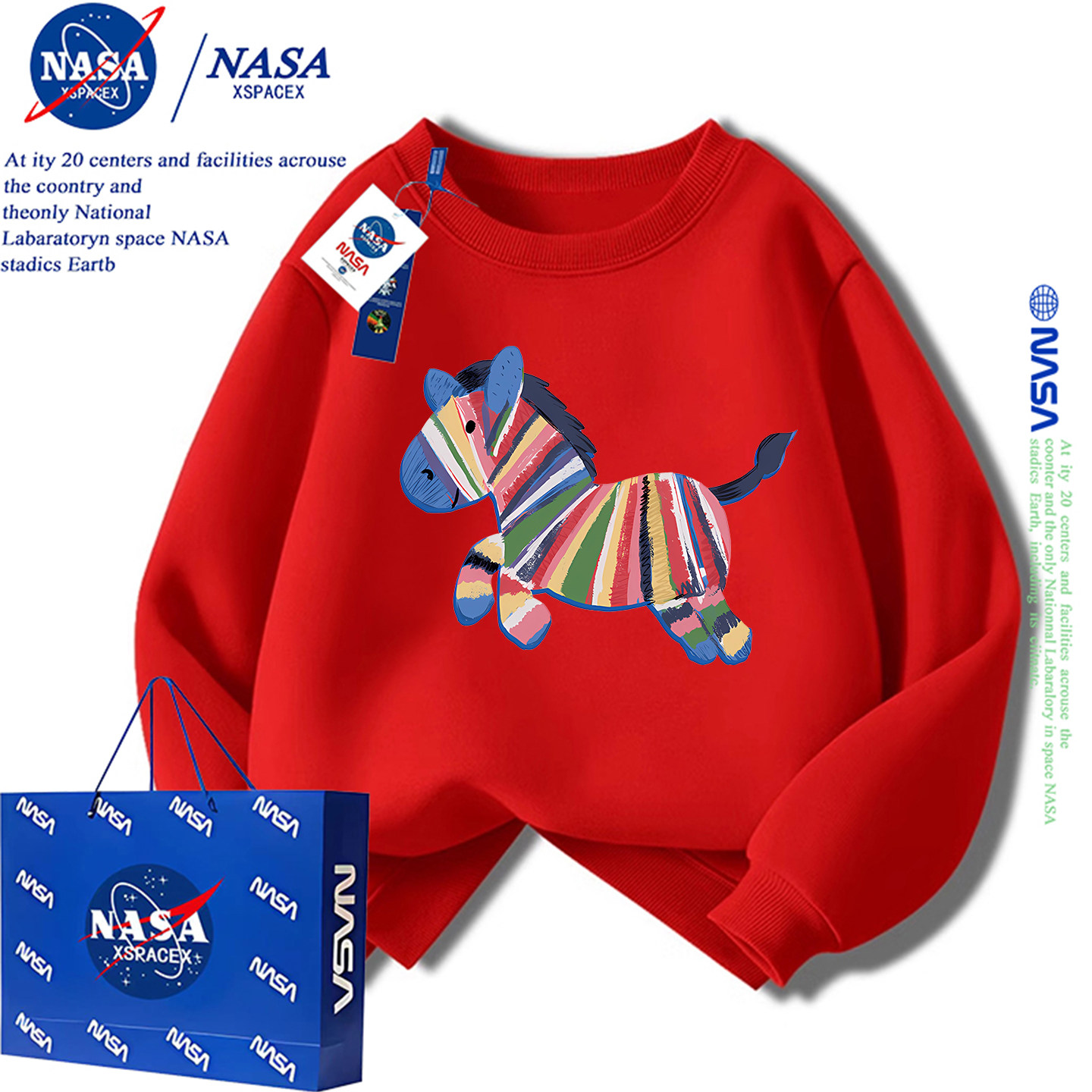 NASA联名本命年马年12岁红色加绒卫衣男女童秋冬季年服外穿上衣潮