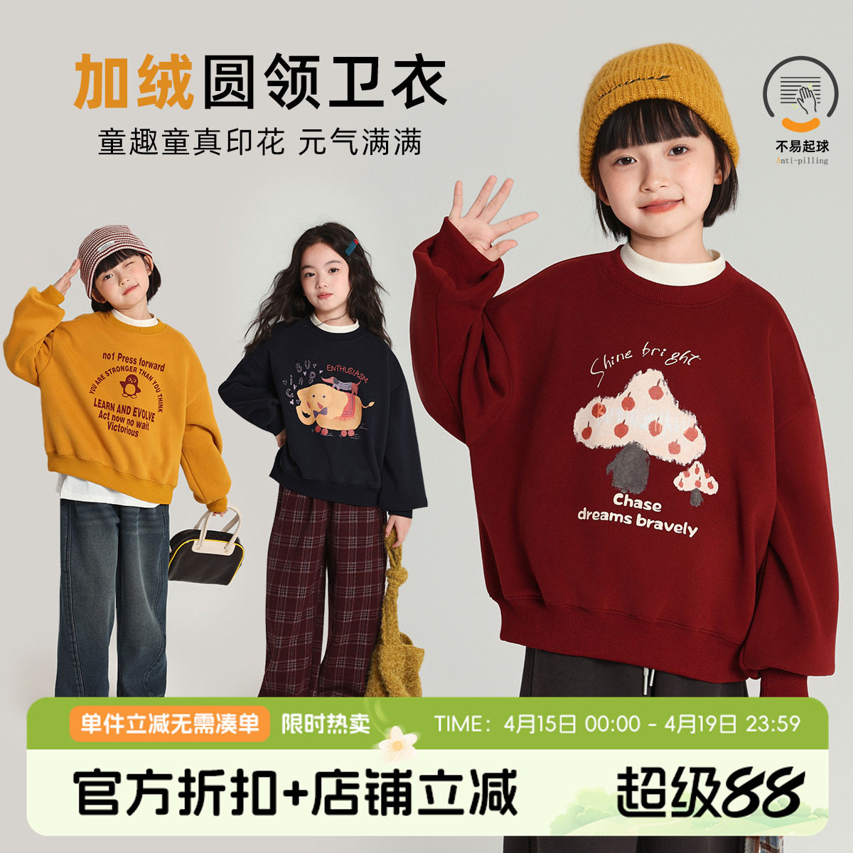 安踏儿童卫衣男童2026年新款春季女童春装宝宝卫衣加绒长袖上衣
