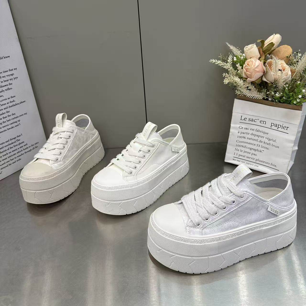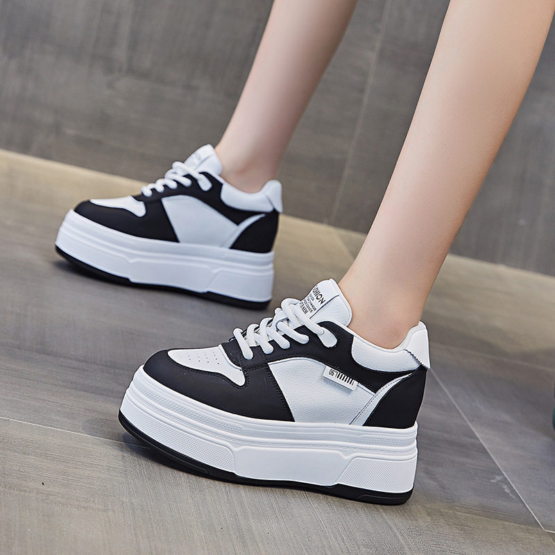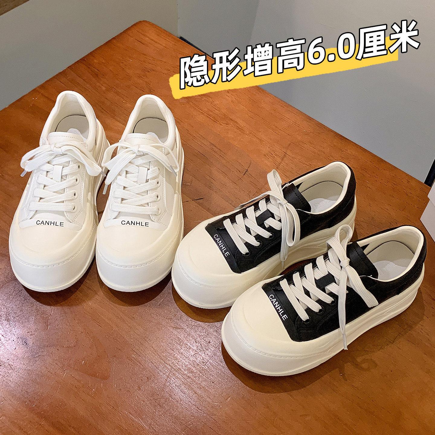 2025早秋韩版系带圆头厚底女鞋舒适小个子增高松糕底时尚小白鞋潮