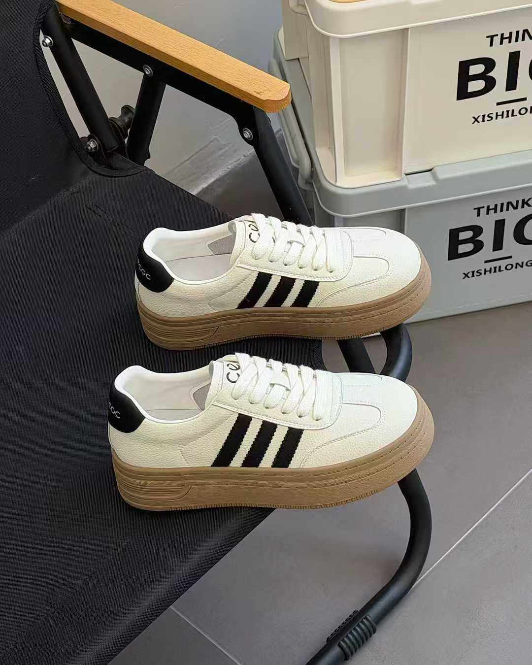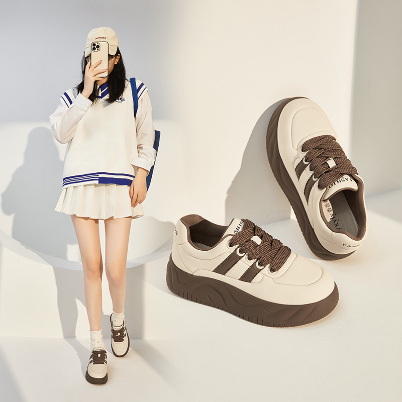 茵茵家2026春秋新款韩版真皮松糕底三条杠小白鞋女系带休闲板鞋潮