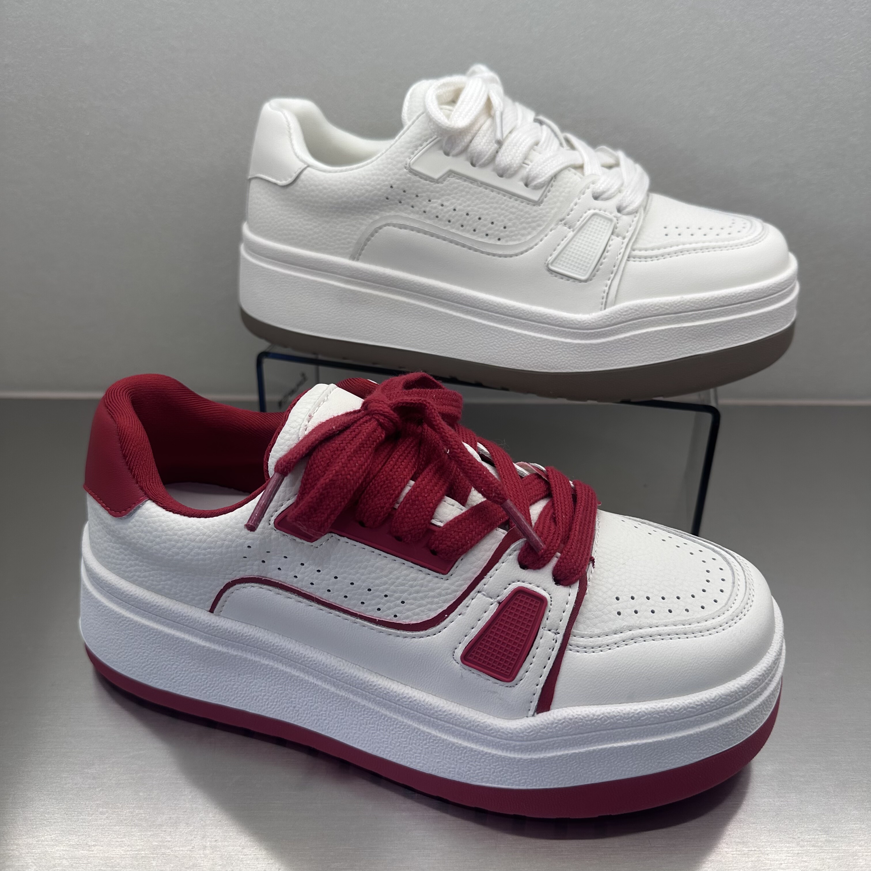 茵茵家2026春秋季韩版真皮简约风红色松糕底小白鞋女系带休闲板鞋