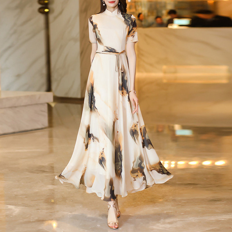 连衣裙女新款雪纺百褶腰带收腰纺织博物馆复古印花有大码外贸日单